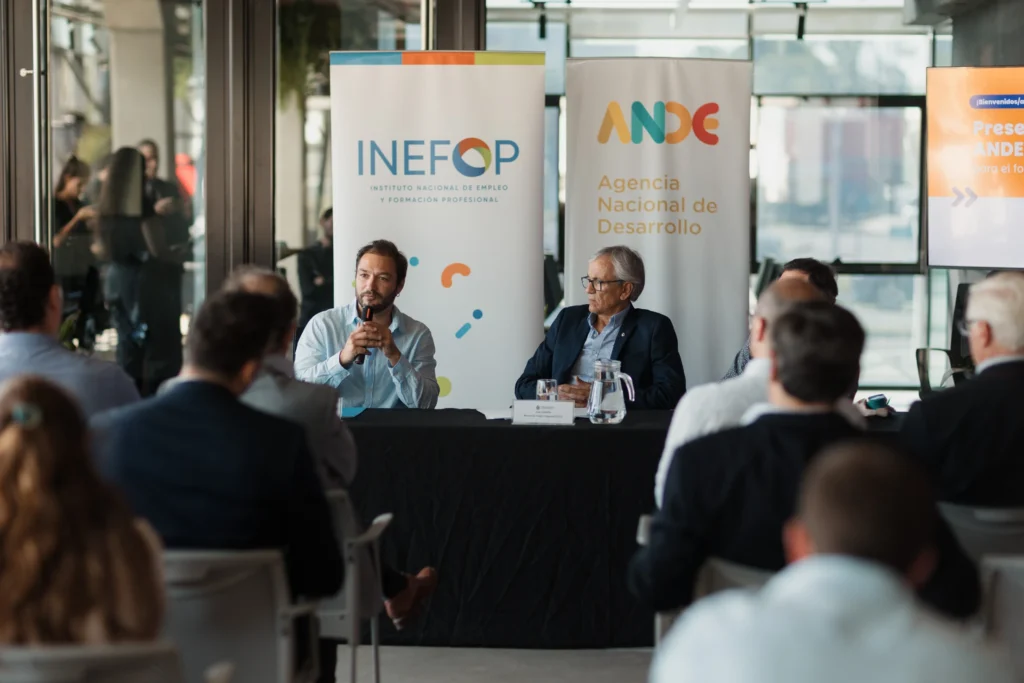 La presentación del convenio contó con la participación del ministro de Trabajo y Seguridad Social, Juan Castillo; el presidente de ANDE, Juan Ignacio Dorrego; y el director general de INEFOP, Miguel Venturiello, además de otras autoridades nacionales.