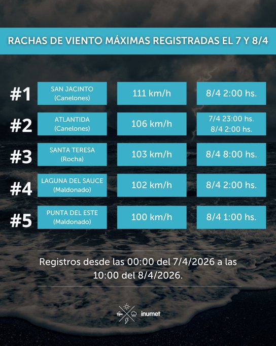El Instituto uruguayo de Meteorología dio a conocer los datos de rachas de viento máximas registradas entre las 00:00 del 7/4 y las 10:00 del 8/4.