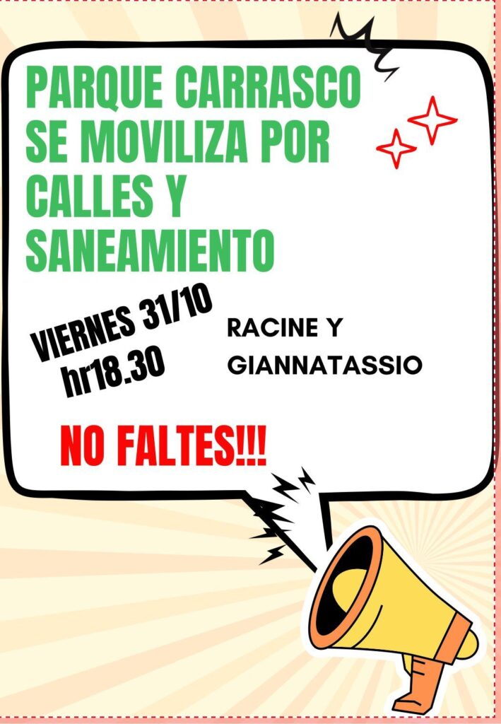 Como informara Metropolitano, un grupo de vecinos y vecinas organizadas de Parque Carrasco, están reclamando por las condiciones de una zona delimitada por calles Racine, Lagos norte, Giannattasio, Ecuador y Rambla Costanera en Ciudad de la Costa, que no tiene pavimentación en calles ni saneamiento. Lilián Bertrand, vocera del grupo, apuntó que la situación se da solo allí y que las zonas limítrofes sí cuentan con pavimentación y saneamiento. Indicó que desde 2021 se presentan notas reclamando con unas 350 firmas, tanto a la Intendencia de Canelones como a OSE. Además los vecinos y vecinas resolvieron movilizarse en Giannattasio y Racine el 31 de octubre a las 18.30 hs.